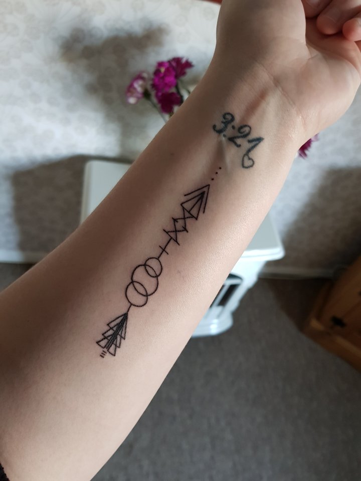 My second and third DS tattoos were actually done on the same day and one was a complete last-minute decision. The biggest of the 2 tattoos on my arm underneath my 3:21 tattoo has a secret meaning. The design itself was made by a mother of a child with Down Syndrome and each part of the arrow has a different meaning. The explanation is that an arrow has to be pulled back in order to shoot forward, it is to show that we are preparing for our amazing future with our special person with DS, included in the tattoo are the Roman numerals for 21. This represents the 21st chromosome and the dots represent trisomy. The rings in the centre represent the connections that are made between families. While the over lapping triangles have a meaning of strength and resilience.