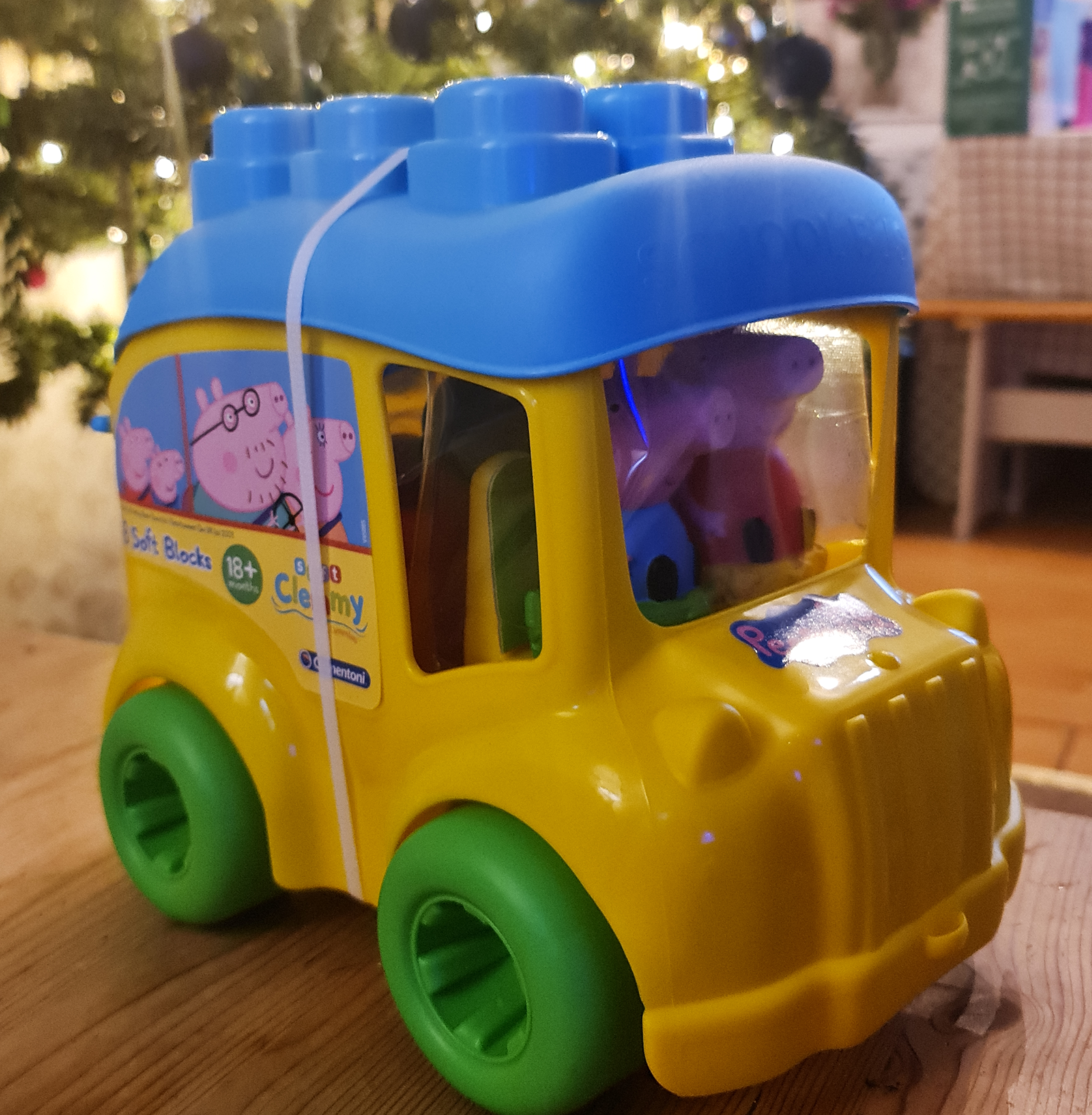 The Peppa Pig Family Bus includes Peppa and George figures and 6 Clementoni blocks.