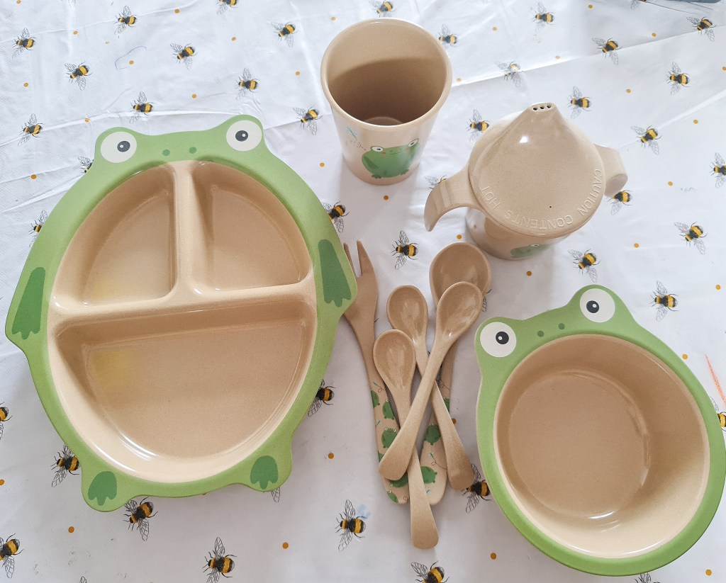 The Nuby Rice Husk range is 6 items at the moment. They are frog themed and are suitable for weaning age up to around 6 years or until they use more grown up dinnerware.