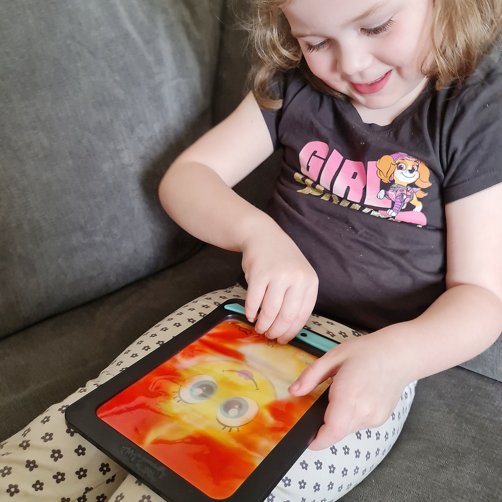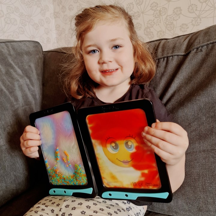 Jellyboards have 2 layers of coloured jelly. The 2 layers create an incredible sensory experience. It allows you to create double colour art work and it is great with both the stylist and your finger. It is amazing for sensory touch and with Jellyboards the possibilities are endless. Cleo preferred the Jellyboards. The 2 colours allowed her to be so creative with the different backgrounds too, she could play differently each time.