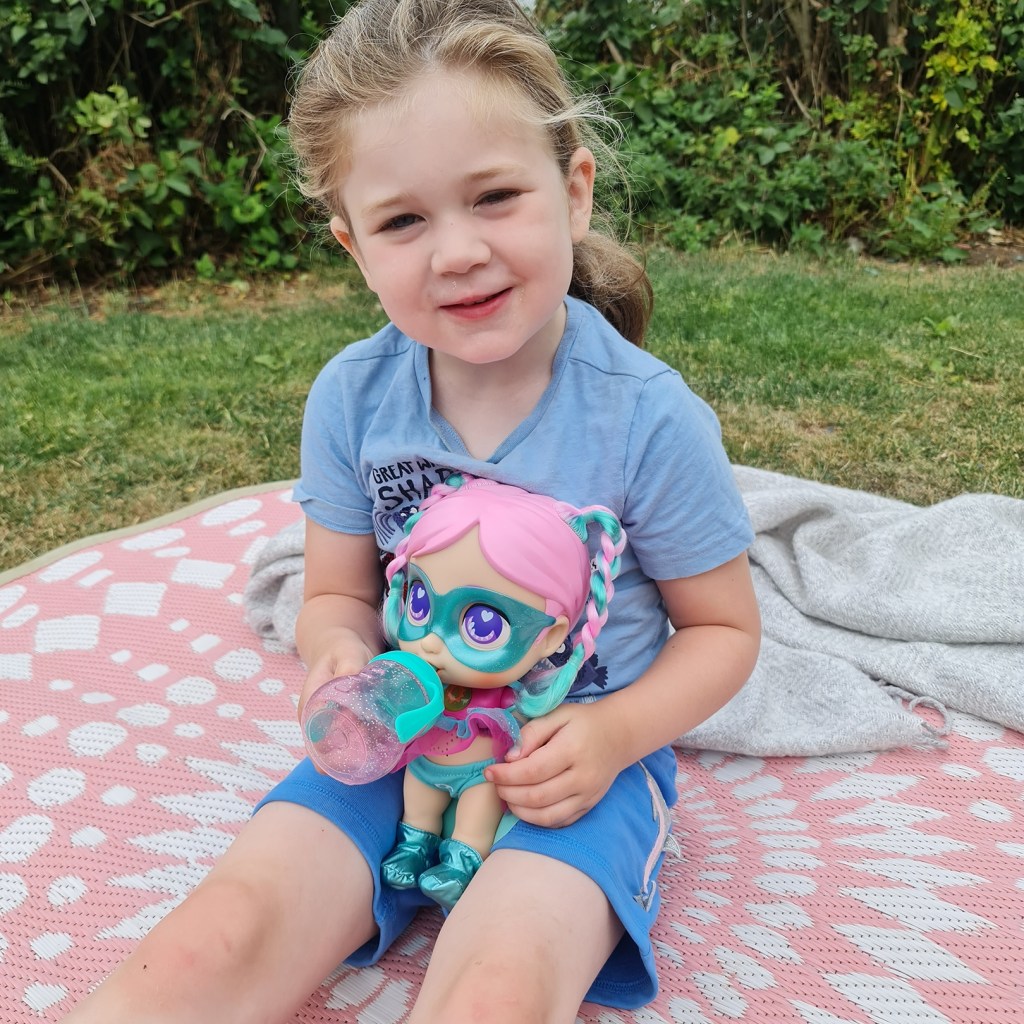 Each of the dolls has its own message. Cleo got Gabi and her message is ‘The little Gabi is very cheerful and full of light. She is always happy and loves to collect sunglasses. Playing outdoors in daylight is one of your favourite activities. When you snack the magic bottle, the Power of the Sun is activated in it. You can heat anything with your hands!’ This dolls is perfect for Cleo and it reminds be alot of Cleo too! She loves playing outside in the sun and is full of light. We always say that Cleo is our little ray of sunshine so the Gabi Baby is ideal for Cleo.