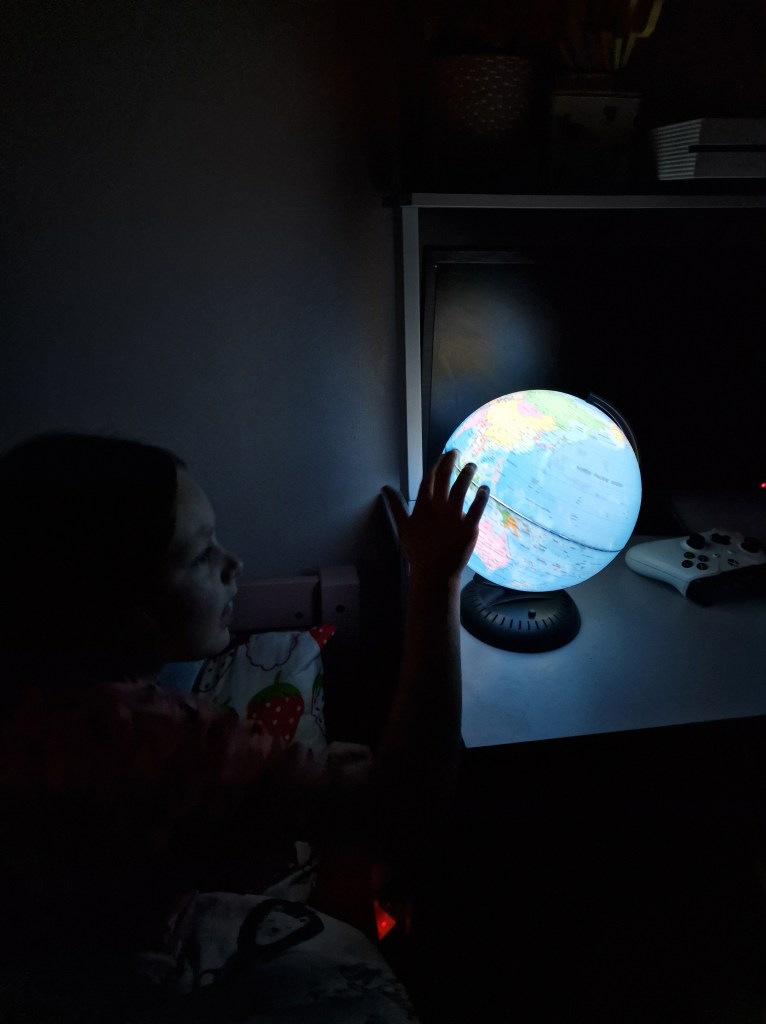 The globe we use is the Science Mad! Light Up Globe. It doubles are a globe in the day and a night light at bedtime. It runs on batteries so can be moved around and doesn’t have to be kept in one place. The globe is the perfect size for a bed side table or playroom. A globe like this is a timeless toy. They make amazing education toys and children will learn without even realising it.